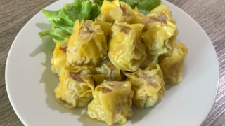 街中や屋台村ではシュウマイ屋台をよく見かけます。タイのストリートフードの一つでしょう。おやつ感覚で食べるのです。 黄色の皮で包まれた小ぶりな蒸しスタイルが基本。タイのシュウマイの皮は何故か黄色いワンタンの皮で包んであるのですよ。