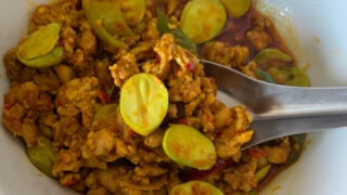 パットサトーのパットは「炒める」、サトーとは、和名ネジレフサマメノキの種子であるサトー豆 (Sator bean/Stink bean) のこと。パットサトーとは、このサトー豆を使った炒めもの料理の総称です。エビや豚肉、鶏肉などと一緒に炒めたタイ南部の料理です。