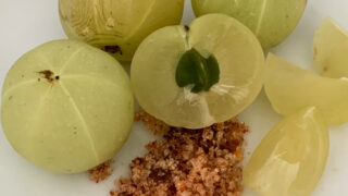 アグンドーンは、匂いの薄いらっきょうの甘酢漬けに近い風味と食感。皮ごと丸かじりするのですが、皮と果肉のシャキシャキ感とぶどうの種を噛み潰した時のカリカリ感が非常に面白いですね。お酒のあてにもなりますよ。