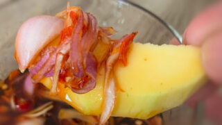 マムアンナンプラーワーンとは、若く硬い青マンゴーにナンプラーに砂糖を加えて煮詰めた甘いソース、ナンプラーワーンを付けて食べるデザート。例えば、カオニャオマムアンのように立派なデザート名になっているのが、マムアンナンプラーワーンなのですよ。