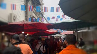 バンコクのシンボルにもなっている鳥居のような赤い巨大なブランコ、サオチンチャーの近くにある歴史ある朝市がトロックモー市場。毎日午前5時から午前10時頃までの間、路地の両側には食べ物系を中心に屋台がずらりと並びます。