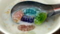 ココナッツミルクの冷たいデザートによく入っている赤色の透明感、サクサク感のある不思議な食べ物。タプティムグロープと言います。タプティムとは「ザクロ」の意味。名前の通りザクロの実のような見た目のデザートです。