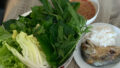 チャプルーの葉でいろいろな具材を包んで食べるおやつ料理がミヤンカムです。このミヤンカムを応用して、庶民の魚であるプラートゥーとたくさんのハーブ、そしてカノムジーンを入れ、チャプルーの葉の代わりにグリーンリーフレタスで巻いて食べる料理がミヤンプラートゥーです。
